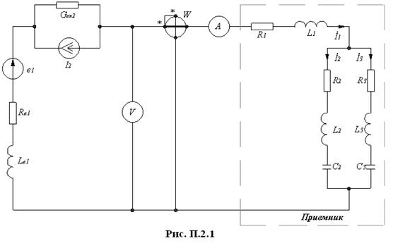 Домашнее задание “Расчет цепи синусоидального тока комплексным методом” На рис. П.2.1 приведена схема электрической цепи, содержащей источники ЭДС и тока. Там же указаны величины внутренних сопротивлений и проводимостей источников. Остальные численные значения параметров приведены в табл. П.2.1. Требуется для данной схемы произвести расчет следующих величин: 1. Определить действующие значения токов во всех ветвях цепи и напряжений на зажимах ветвей. 2. Определить показания приборов, реактивную и полную мощности, коэффициент мощности приемника. Проверить баланс мощностей. 3. Построить на комплексной плоскости векторную диаграмму ЭДС, токов и напряжений. Показать на диаграмме, что токи удовлетворяют первому закону Кирхгофа, а ЭДС и напряжения – второму закону Кирхгофа. 4. Написать выражения для мгновенных значений: а) тока и напряжения на зажимах приемника; б) активной, реактивной и полной мощностей приемника. 5. Таблица П. 2.1