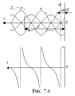 Из этих уравнений видим, что вновь появляются стоячие волны. В отличие от режима холостого хода в конце линии будут узел напряжения и пучность тока (рис. 7.5). Входное сопротивление равно При При очень высоких частотах короткозамкнутая линия, длина которой равна 3). Режим реактивной нагрузки Имеем