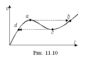 Вычитая графически из зависимости Точки Особая точка А является точкой резонанса, т.к. в этой точке Вследствие наличия в цепи потерь и высших гармоник, фактическая характеристика приобретает вид (сплошная кривая, рис. 11.10). При U= const падающая часть ac характеристики является областью неустойчивых режимов. Пусть при U= const некоторому режиму соответствует точка на участке ас. Тогда всякое случайное увеличение тока приведет к уменьшению падения напряжения в цепи, следовательно, к дальнейшему увеличению тока. Наоборот, всякое случайное уменьшение тока приведет к увеличению падения напряжения, следовательно, к дальнейшему уменьшению тока. В обоих случаях изменение тока будет продолжаться до тех пор, пока ток не достигнет значения, определенного точкой пересечения прямой U= const с одной из падающих частей характеристики. В любых режимах этих частей характеристики режим будет устойчив, т.к. случайное увеличение тока приведет к увеличению падения напряжения и ток должен будет уменьшиться, а случайное уменьшение тока приведет к уменьшению падения напряжения и ток должен будет увеличиться. Включив последовательно с цепью достаточно большое линейное сопротивление, можно получить устойчивую работу и на падающем участке характеристики. Найдем выражения для максимального тока при данном виде феррорезонанса. Предположим, что катушка имеет характеристику, описываемую следующим выражением: