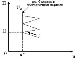 Рис. 4. Кривая Филипса в долгосрочном периоде Длительная инфляция может перерасти в стагфляцию, т.е. одновременный прирост инфляции и безработицы. Тогда в долгосрочном периоде кривая Un превратится из нисходящей в восходящую (рис. 5).