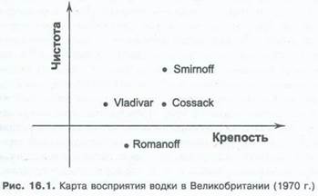 Политика поддержания контактов между вашей маркой и потребителем предпочтительнее, чем налаживание отношений между вами и конкурентом. Концентрация на потребителе помогает обнаружить аспекты, которые ваши соперники оставили без внимания. Чрезмерный интерес к действиям конкурентов отвлекает и ослабляет. Если отношения марка–потребитель достаточно крепки, вам не о чем беспокоиться. В любом случае, вряд ли вам удастся добиться чего-то особенного в области развития контактов другого рода. Вы можете отвечать только за себя. Возможно, Яго и участвовал в разрыве отношений Отелло и Дездемоны, но его личная лепта не сравнима с вкладом в разрушение семьи главных действующих лиц. Потребитель и марка – две индивидуальности, которые сваха-маркетолог пытается объединить. Обычно наиболее эффективным оказывается метод представления возможному партнеру лучших черт марки. Существенно важной здесь оказывается информация о ваших конкурентах и их местонахождении. Как правило, ее используют для того, чтобы не пересекаться с соперниками. Прежде чем вы начнете что-то предпринимать, потребуется «карта местности». Картография воображения потребителей может показаться несколько опережающей наше время, а расчеты чрезмерно современными, но основной принцип очевиден: необходимо разложить на составляющие нужды и потребности, а затем понять, в какой степени соответствуют им конкурирующие марки. В 1970 г. целевая аудитория потребителей водки Великобритании прежде всего была заинтересована в чистоте (высокой степени очищенности) продукта. Вслед за основным требованием следовал длинный список постепенно утрачивавших значимость прилагательных. Одним из наиболее распространенных критериев качества спиртных напитков была «мягкость». Интересным пунктом была крепость, поскольку водка почему-то имела репутацию более крепкого в сравнении с виски, джином или ромом напитка, хотя на самом деле она была на 6,5° слабее, Если вам удалось выделить наиболее значимые критерии, вы получаете возможность определить, как котируется та или иная марка по принятой шкале. Математика начинается, когда возникает набор определений. То, что является самьм важным для потребителя, может не подойти маркетологу. Вы либо останавливаетесь на мероприятии, вероятность которого наиболее высока, и забываете про остальные, либо, применив факторный анализ или анализ по принципу групп, сокращаете количество прилагательных до приемлемого. А еще лучше – попробуйте нанести свои позиции на «карту местности». Давайте построим диаграмму, на одной оси которой – чистота продукта, а на другой – его крепость. Тогда водочный рынок Великобритании в 1970 г. можно представить так, как это показано на рис. 16,1.