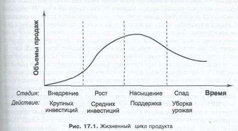 Теория жизненных циклов продукта и марки заключается в следующем: там, где есть жизнь, есть и смерть. Это естественный порядок вещей. Поскольку маркий продукты создаются, они должны умирать. Ими легче управлять, если маркетолог знает, какой жизненный этап проходит продукт: не принято, чтобы марки среднего возраста носили джинсы. Задача маркетолога – максимизация прибыли в период существования товара на рынке. Сделать это можно, лишь внимательно наблюдая за жизнью продукта (рис. 17.1). Как только марка попадает в период спада, пора готовиться к ее торжественным похоронам – применение реанимирующих средств в подавляющем большинстве случаев лишь затягивает агонию, но не спасает умирающего.