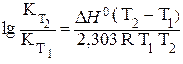 Зависимость константы равновесия от температуры (для температуры Т2 относительно температуры Т1) выражается следующим уравнением Вант-Гоффа: