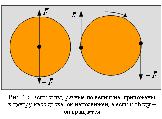 Может быть так, что все силы, действующие на тело, уравновешены, тем не менее, тело будет ускоряться. Например, если приложить две равных и противоположно направленных силы (их называют парой сил) к центру масс колеса, то колесо будет покоиться, если его начальная скорость была равна нулю. Если же эти силы приложить к разным точкам, то колесо начнет вращаться (рис. 4.5). Это объясняется тем, что тело находится в равновесии, когда сумма всех сил равна нулю в каждой точке тела. Но если сумма внешних сил равна нулю, а сумма всех сил, приложенных к каждому элементу тела, не равна нулю, то тело не будет находиться в равновесии, возможно (как в рассмотренном примере) вращательное движение. Таким образом, если тело может вращаться относительно некоторой оси, то для его равновесия недостаточно равенства нулю равнодействующей всех сил. Чтобы получить второе условие равновесия, воспользуемся уравнением вращательного движения