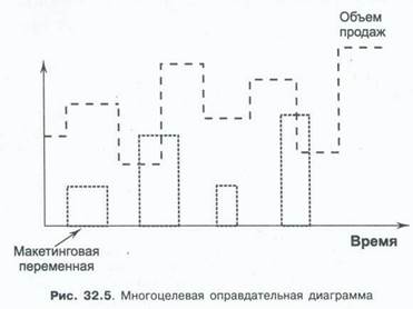 • «Лукавство с одной переменной» основано на любви руководства компании к графикам, на которых изображаются, допустим, объем сбыта компании и рекламные расходы. Умный маркетолог легко покажет вам положительную связь между объемом продаж и расходами на рекламу, между объемом продаж и мероприятиями по продвижению, между объемом продаж и рекламными распродажами. Руководству демонстрируется одна из таких диаграмм в расчете на то, что пораженное руководство выдаст маркетологу карт-бланш на все остальные предлагаемые мероприятия (рис. 32.5).
