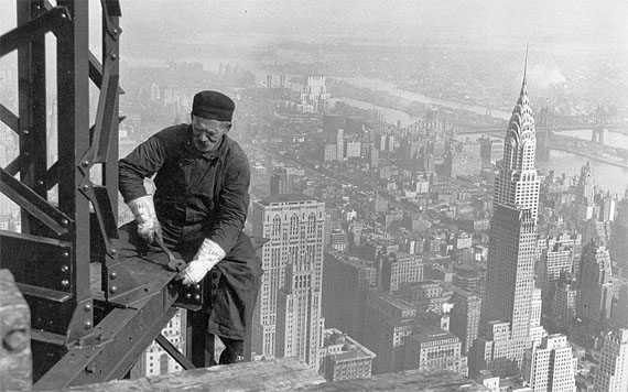 Рабочий на строительстве Эмпайр‑Стейт‑Билдинг на фоне Крайслер‑Билдинг