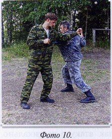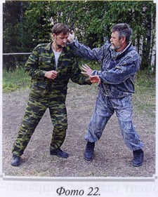 Примечание: Никогда не атакуйте противника одиночным ударом. Всегда нападайте серией из четырёх‑семи ударов. Атака всегда идёт по открытому месту. Открылись глаза – атакуйте по глазам. Открылось горло – бейте по горлу. Открылся пах – атакуйте в промежность. Удары по глазам и горлу должны сочетаться с ударами по голени или паху. Часто удары руками наносятся одновременно с ударами ног, такова характерная черта нашей воинской традиции. Чтобы «открыть» противника, используется масса обманных движений. Это и имитация ударов, и обманные уходы с линии атаки, и различные «ловушки» для рук и ног противника... Подобных движений много, но именно они позволяют совершить внезапный «взрыв», когда по открытому или провалившемуся в пустоту противнику наносится серия мощных ударов по болевым точкам.