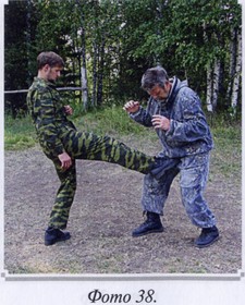 Примечание: Удары ногами очень быстрые, мощные, но невысокие. Выше нижней части живота они не наносятся. Колено в момент удара не выпрямляется. При сильном ударе это создаёт амортизацию, что сохраняет от разрушения суставную сумку. 1. Прямой быстрый удар носком по голени. (фото 37)