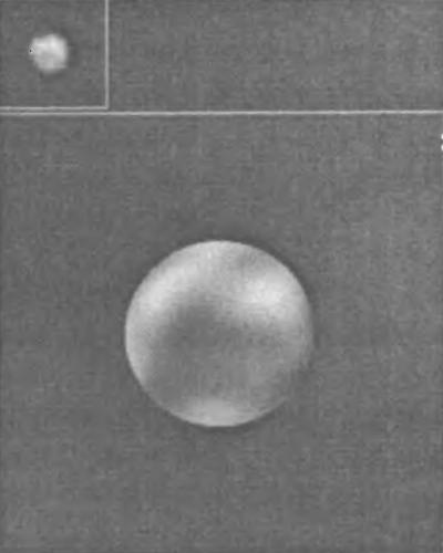 Рис. 9.1. Странная маленькая планета Плутон Фотография любезно предоставлена NASA Плутон делает полный оборот вокруг своей оси за 9 часов 17 минут, а его спутник Харон делает полный оборот вокруг Плутона точно за такое же время. Так что одно к другому повернуты всегда одни и те же полушария Плутона и Харона. В системе "Земля-Луна" к Земле всегда обращено одно и то же полушарие Луны, но не наоборот. Человек, находящийся на ближней к Земле стороне Луны, может увидеть всю Землю, когда в течение суток она будет оборачиваться вокруг своей оси, но человек, находящийся на Хароне, никогда не сможет увидеть больше одного полушария Плутона. Диаметр Плутона — всего 2300 км; это самая маленькая планета Солнечной системы. Он меньше даже четырех Галилеевых спутников Юпитера, спутника Сатурна Титана и спутника Нептуна Тритона. Плутон только в два раза больше своего спутника Харона, диаметр которого 1250 км, поэтому систему "Плутон-Харон" часто называют двойной планетой. И Плутон, и Харон — это ледяные каменистые тела. При температуре на поверхности -233 °C неудивительно, что на Плутоне почти все замерзает. Водяной лед, метановый лед, азотный лед, аммиачный лед и даже замерзшая окись углерода — все это есть на поверхности Плутона. На Хароне тоже были обнаружены некоторые из этих веществ, но не все. Но Плутон вовсе не такой холодный, как может показаться. Астрономы подозревают, что на нем есть "тропические оазисы", где температура постоянно держится примерно на уровне -213 °C. Плутон так далек, что ученые почти не имеют представления о его "географии". В самой отдаленной точке своей вытянутой эллиптической орбиты Плутон находится на расстоянии примерно на 7,4 миллиарда километров от Солнца, а в самой близкой — на расстоянии примерно 4,4 миллиарда километров.