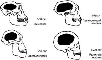 В процессе эволюции мозг увеличился в 2 с лишним раза. Первый раз около 2 млн лет назад – при образовании умелого человека (не нарисован). Второй раз – при образовании прямостоящего человека, и в третий раз – при образовании современного разумного человека. У поздних представителей прямостоящего человека (неандертальцев) объем мозга был не меньше, чем у нас, а лицевая часть черепа – мощная. Сможем ли мы когда‑нибудь понять, чем были заняты эти мозги? Встреть мы наших предков, которого из них мы признали бы «братом по разуму»?