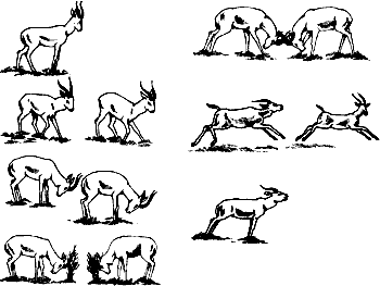 Посмотрим на этом рисунке, как выясняют свой иерархический ранг самцы джейрана. Они вооружены острыми рогами и действуют строго по правилам, ритуалу. Он позволяет выяснить отношения, не калеча друг друга. Завидев противника, вторгшегося на территорию, самец стоит на высоком месте на выпрямленных ногах, высоко подняв голову и рога. Сблизившись, самцы идут параллельным курсом. Тут важно, кто окажется выше ростом. Если никто не испугался, рога переводятся в позу атаки. Но стоят животные параллельно, каждому пока еще можно убежать. Теперь дуэлянты встают напротив и показывают, бодая кусты, что они могут сделать оружием. И только если оба не уступили, они скрещивают оружие. Но при этом они не наносят смертельного удара в бок и брюхо, как поступили бы с хищником, а всего лишь бодаются, заставляя противника пятиться и сворачивая ему шею вбок. Более слабый убегает. Победитель гонится за соперником, но не очень быстро, давая ему уйти. Прекратив погоню, победитель издает вдогонку победный крик. Этот крик утверждает его в собственных глазах (и глазах самок, если они видели турнир), а проигравшего – подавляет.