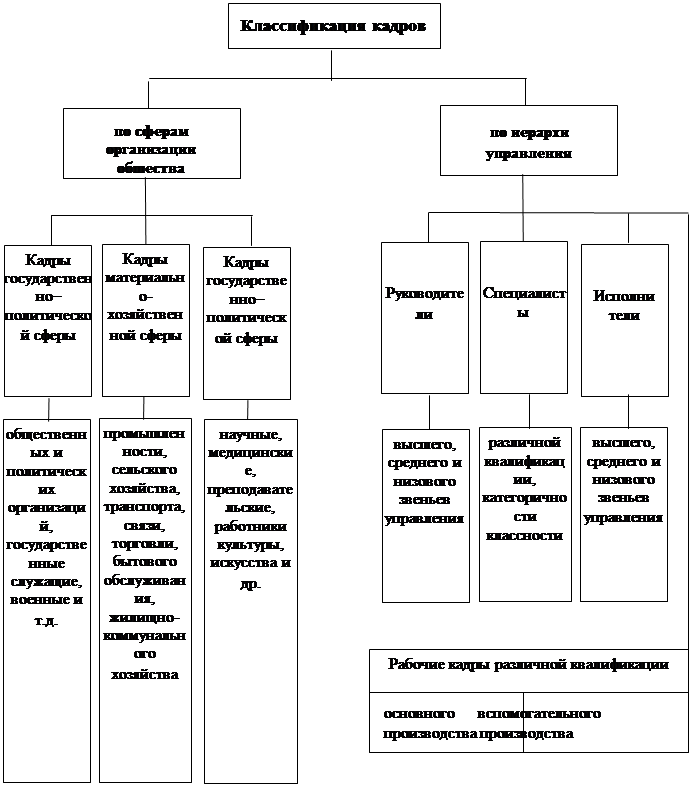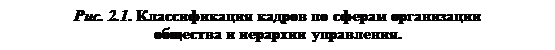 Кадры – понятие одновременно собирательное и многоуровневое. Собирательное – потому, что объединяет работников различных отраслей деятельности, профессий, специальностей, видов труда. В этом смысле употребляют выражения кадры хозяйственные, научные, медицинские, преподавательские, военные и т. п. Принадлежность работника к той или иной отрасли дает лишь наиболее общее представление о его положении в общественном разделении труда, выполняемых функциях и профессиональных качествах. Классификация кадров по основным сферам организации общества и основным уровням управления приведена на рис. 2.1.