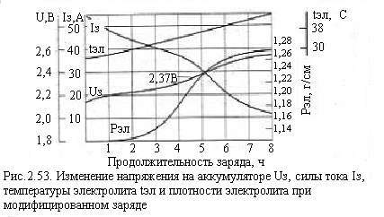 Выбор оптимального значения, зарядного, напряжения зависит от температуры электролита и технического состояния батареи. Чем выше зарядное напряжение, тем интенсивнее заряд, но больше газовыделение и влияние других побочных факторов. При данном способе заряда возможен перегрев батареи вследствие большой силы тока в начале заряда. Заряд при постоянном напряжении затрудняется в условиях низких температур, так как резко возрастает внутреннее сопротивление батареи. Способ заряда при постоянном напряжении отличается простотой, так как для поддержания необходимого режима заряда не нужны регулирующие устройства. Зарядное напряжение на каждый аккумулятор должно составлять 2,4-2,5 В, следовательно, зарядное напряжение для 6-вольтовой батареи должно быть 7,2-7,5 В, а для 12-вольтовых - 14,4-15,0 В. Сила зарядного тока для каждой батареи устанавливается автоматически. В процессе заряда с увеличением ЭДС батареи сила тока уменьшается и к концу заряда практически понижается почти до нуля. Батарею можно зарядить до 90 --95% от номинальной емкости. Частным случаем заряда при постоянном напряжении является заряд по закону “ампер-часов”, при котором аккумуляторная батарея заряжается током силой, численно равной 95% емкости, которую надо сообщить батарее при последующем заряде. Сила зарядного тока при таком условии снижается. Процесс заряда будет форсированным, но с наименьшими потерями энергии, без перегрева электролита и обильного газообразования. Заряд по закону "ампер-часов" позволяет обеспечить полный заряд батареи за 4-4,5 ч, а до 90% номинальной емкости батарея заряжается за 2,5 ч. При постоянстве напряжения подзаряжаются батареи на автомобилях. Так как полный заряд батарей в этом случае невозможен рекомендуется периодически снимать батарею с машины и проводить полный заряд при постоянной силе тока в стационарных условиях. Модифицированный заряд. Целью модифицированного заряда является снижение силы тока в начальный период заряда и уменьшение влияния колебаний напряжения в зарядной сети на зарядный ток. В цепь заряда включается небольшой резистор. Напряжение зарядной сети поддерживается постоянным в пределах от 2,5 до 3,0 В на каждый аккумулятор. Оптимальное для свинцовых аккумуляторов напряжение 2,6 В обеспечивает заряд примерно за 8 ч. Изменение параметров свинцового аккумулятора в процессе модифицированного заряда при напряжении зарядной сети 2,63 В и добавочном сопротивлении 0,0091 Ом показано на рис, 2,53. Уже через 7 ч аккумулятор восстанавливает отданную при разряде емкость и далее в течение часа работает в режиме перезаряда.
