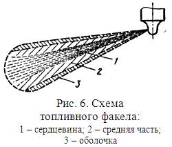 Топливо, введенное в цилиндр в виде факелов, распределяется в воздушном заряде неравномерно, т.к. число факелов, определяемое конструкцией распылителя, ограничено. Другой причиной неравномерного распределения топлива в камере сгорания является неоднородная структура самих факелов. Обычно в факеле (рис. 6) различают три зоны: сердцевину, среднюю часть и оболочку. Сердцевина состоит из крупных частиц топлива, которые имеют наибольшую скорость движения. Средняя часть факела содержит большое количество мелких частиц, образовавшихся при дроблении передних частиц сердцевины силами аэродинамического сопротивления. Распыленные и потерявшие запас кинетической энергии частицы топлива оттесняются и продолжают движение лишь за счет потока воздуха, увлекаемого попутно факелом. В оболочке находятся наиболее мелкие частицы, имеющие минимальную скорость движения.