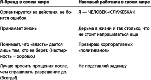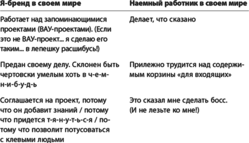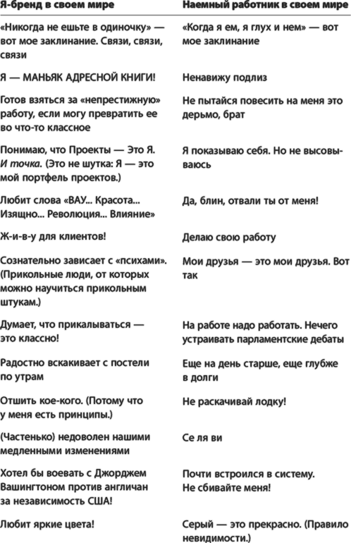 А вот и решение: трансплантация иного отношения! То есть начинаем думать и действовать как Независимый Подрядчик. Даже если в обозримом будущем вы продолжите где-то получать зарплату. Главное, что Независимый Подрядчик полагается только на себя. Зависит только от своих способностей… и постоянного самосовершенствования. В конце концов, у Независимого Подрядчика есть только его собственный список достижений. То есть его Проекты. Я называю такого Независимого Подрядчика по духу «независимо мыслящей единицей», практически брендом. А именно Я‑брендом. Бренд – это условное обозначение. С ним связано некоторое обещание. Нечто надежное. («Пауза, которая освежает».) Нечто суперское. («Просто делай это».) Давайте бросим короткий взгляд. Вот как мы с коллегами противопоставляем типу из бизнес‑центра «Дилбертландия оптимального размера» Я‑бренд из группы «Новый мировой порядок, несущий освобождение»:
