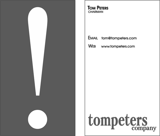 Весь мой капитал состоит из 50 тем. (Плюс еще немного за счет мошенничества с дополнительными разделами вроде «22а».) Так какого черта в наше и без того сумасшедшее время я буду посвящать огромные два процента своего капитала визитным карточкам? Потому что… ПЕРВОЕ ИДЕТ ВНАЧАЛЕ. Визитные карточки многое значат. Визитные карточки – это ваша подпись. Часто первая ваша подпись – это ваша… визитная карточка. Визитные карточки – это клево. Или… не очень клево. Визитные карточки… никогда не бывают нейтральными. Как‑то пару лет назад я взял на работу сотрудницу исключительно из‑за ее визиток. Ладно, я преувеличиваю. Я взял ее на работу, потому что она была классной чувихой. Но натолкнула меня на эту мысль именно ее визитная карточка… которая очень сильно отличалась от визиток остальных 200 человек, приславших мне свои резюме. Она была такой, что я мгновенно решил переложить ее резюме в стопку «Второй этап отбора». (МНЕ ПО‑ВЕЗ‑ЛО!) И для нас с вами это важно так же, как и для BMW, Nike или Apple. Может, даже важнее (может, даже намного важнее): это одна из немногих вещей, при помощи которых вы можете сразу и мгновенно выделиться из толпы.