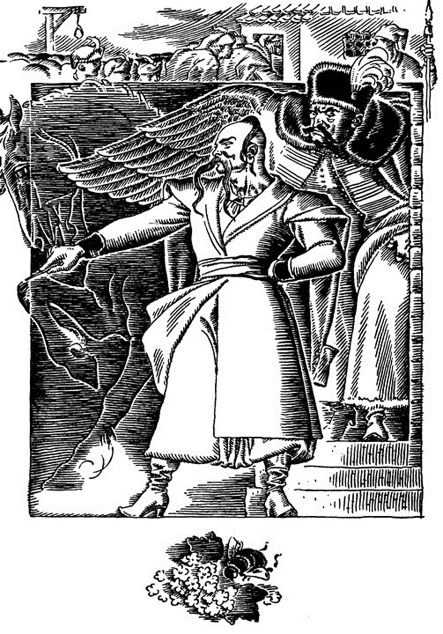 Тільки-но з-під шила виникло на чорнім мурі кінське око, як воно зразу й блимнуло. Щойно рука Мамаєва вивела на стіні шию коневі, як заграла вона зразу ж дрібним дрожем нетерпіння. Тільки намалював Мамай передні ноги, як вони, басуючи, затупали об землю. З кожним помахом руки Мамая виразніше й виразніше виникали на стіні обриси добрячого румака, чорнісінького (бо ж чорна була стіна), з білим хвостом, з білою гривою, з білими щітками над кожним копитом (бо нашкрябані шилом риси ставали білими від крейди, що схоронилась попід шаром кіптяви). Кінь з кожним помахом руки Мамая, з кожним дотиком шила оживав. Козакові треба було б поспішати, бо вже розвиднілось, і за вікном загомоніли, прокидаючись, рейтари, і горобці зацвірінькали під стріхою в’язниці, і знову зацюкали сокири на шибениці, споруджуваній на майдані, біля цюпи, де вже кипіло морем юрмище збентежених людей, які, прочувши про неминучу страту народного улюбленця, посунули сюди з усіх усюд. Але Мамай, як і належить сутому художникові, забувши про все на світі, малював та й малював, тобто не про життя забувши, а про смерть, про плин часу, як те в нього подеколи бувало, коли Мамай казав: «Хапай час за чуприну!» — бо ж сам час таки боявся Мамая, не чіпав його, шанував його і не старив. Козак іще виводив кониченькові спину та круп, а Добрян від нетерпіння аж ніби заіржав, та преголосно так, що рейтари біля тюрми загомоніли, про щось засперечалися, хтось не по-наському вилаявся, і забряжчала зброя, і загупали хапливі кроки, і задзвеніли ключі. Але раптом все стихло. Чийсь голос, владний і гучний, кинув кілька слів наказу. І Козак Мамай зразу ж таки впізнав, що то прибув сюди сам гетьман Однокрил. 53 Йому не спалось, гетьманові, того ранку. Прокинувшись, ясновельможний звелів зганяти на майдан перед хурдигою цікавих, а коли йому ясували уклінно, що зганяти нікого не треба, бо ж людей і без того зійшлась сила-силенна, пан зацний гетьман наказати зволив — юрбу розігнати, щоб, бува, Козака Мамая не одбили чи не викрали, і вже когось там, якихось цікавих, хто за першим наказом не відійшов, на помості під шибеницею хорошенько в три берези по дупах затинали… Пан гетьман, як і завше, чепурився перед виходом з опочивальні. Голяр збивав йому на тімені піну, і не з гречаного борошна, як на всіх інших довбешках, і не з милких корінчиків перекотиполя, а з доброго марсельського мила, і шкріб йому голову круг оселедця, схожого на кобилячий хвіст на бунчуці гетьманському, шкріб старанно, бо гетьман Однокрил завжди намагався виглядати гарним і охайним. Він дивився на себе в дзеркало з венеційського скла і сам собі сильно подобався, особливо збоку, в тому повороті, в якому карбували його профіль на монетах, бо й справді-таки був, нівроку йому, помітної вроди шляхтич, і він бачив у тому венеційському верцадлі на обличчі в себе два носи. І ділив їх на два, бо ж, хоч і двойнило йому в очах, навпомацки знав, що ніс у нього, як і в усіх людей, один. Бачив чотири ока. І їх ділив на два. І все інше ділив. Не ділив тільки свої півтора вуса, як і вуса полизачів і приклонників, бо ж ті всі й собі повідтинали по одному вусові (як ми це вже з вами, читачу, знаємо), лабузнячись до пана гетьмана, що в нього волосся й нігті чомусь не росли. Підвладні ясновельможного гетьмана України, кому кортіло заслужити високий чин, посаду, грошики чи просто похвалу, в у
