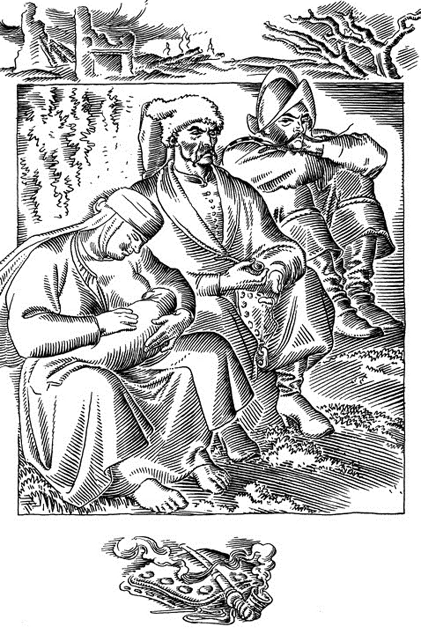 Прудивус безпорадно спинився, бо дитинка, ніякого поживку не діставши, заплакала знов, і Тиміш, недосвідчений, вирішив трішки постояти, поки воно знову засне. Поблизу виспівував, прихилившись до бандури, старий кобзар, висушений усіма вітрами України, вибитий усіма лихами та злиднями її, виснажений безхаттям і безхліб’ям, обшарпаний, майже голий, і дивно було, в чім тільки його душа держалась, а ще дивнішим був його могучий голос, що дуднів, як той лев, котрого спудей бачив колись на київському ярмарку, завданого в прездорову, забиту ґратами бодню. Почувши бренькіт бандури й такий дужий голос а чи й зовсім уже охлявши, дитинка знову замовкла, і Прудивус підступив до співака трохи ближче, та чималий гурт, що облягав кобзаря, мов змело вітром: добрі люди, звісна річ, од переодягненого рейтаром бідолашного спудея раптом шарахнули геть. Ось так він і лишився перед кобзарем сам-один, з дитинкою, невміло притуленою до грудей, та з Песиком Ложкою, що раптом, завилявши хвостом, кинувся, мов до знайомого, до якогось, видно, бувшого січовика, вбраного в широченні червоні запорозькі штани та в пошматований шляхетський кунтуш, із сережкою в усі, як у Мамая, вже старого, сивовусого та сивоголового, як циганський король, але й чорнобрового, як молодий лицар, стрункого, як польський гусар. Песик Ложка, рвонувшись до свого знайомого, котрий сидів собі на березовім пеньочку, неподалік від кобзаря, крутнув гостреньким хвостиком і повернувся до Прудивуса, який на того сивого уваги досі й не звертав, бо слухав кобзаря, думу про смерть Хмельницького: …Бо я стар, болію, Кобзар оповідав про те, як воліли козаки не обирати в гетьмани джуру Хмельницького, бо той — шляхтич, — Близько мостивих панів живе; Слухачі, котрі шарахнули від німчина, ремісники, посполиті, лейстрове козацтво, поранені й пошарпані в боях із мирославцями жовтожупанні вояки, слухали, ставши осторонь (на гетьманщині козаків зосталось обмаль), а дехто вже й зауважив на морді в чудернацького рейтара ревне захоплення співом кобзаря. — Люди чого відійшли? — спитав сліпий кобзар у сивовусого січовика. — Ти чуєш, Дмитре? — Чую, Свириде, — неуважно мовив старий Дмитро, наче повертаючись з льоту в далекий край, куди занесла його дума про тую смерть, яку він бачив сам, Дмитро Потреба, бувши колись при Хмелі бунчужним. — Я питаю: чого люди шарахнули? — Німець підійшов. — Один? — Один. — Чого йому? — Спитай у нього сам, Свириде, — скоса поглянувши на чудернацького рейтара і чогось раптом усміхнувшись, відмовив старий січовик. — Іди собі, швабе! — найгуркотливішими низами дужого свого голосища гримнув кобзар, зненацька вдарив по струнах: — Ой дай, жінко, нагая, проучити німчая! — і замовк так само несподівано, як заспівав. Прудивус сердито забелькотав, мішаючи слова латинські, грецькі, німецькі, циганські, єврейські, які тільки знав, які тільки міг вимудрувати чи згадати, але старий Потреба пирснув рейтарові в пику: — Облиш, козаче! Прудивус забубонів ще сердитіше, бо не хотілося в стані ворогів по-дурному важити головою, та й чужа дитина спала на руках, та й наука ж чекала в Києві в академії, та й заклики Мелхиседека і Романюка він мусив передати кобзарям, щоб ті понесли їх по Україні, одмилюючи очі посполитим, одуреним однокрилівщиною, та й життя ж, нівроку, хоч яке було трудне, але ж і воно — одне-однісіньке, цік