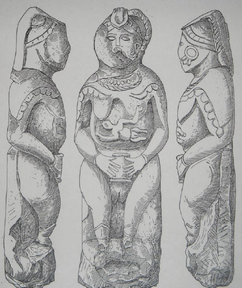 Изваяние женщины с девочкой (Луганская обл., XII век). Рисунок из статьи С.А. Плетневой «Женская половецкая статуя с ребенком». Советская археология. 1974, № 3, с. 258–264.