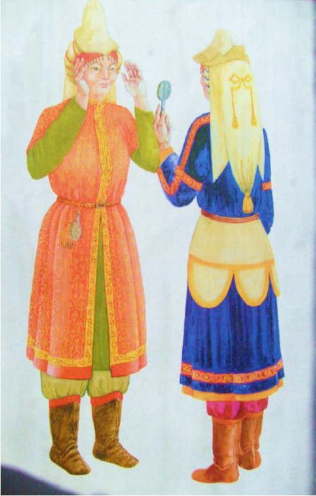 Реконструкция женского костюма, выполненная на основе каменных половецких изваяний (по С.А. Плетневой)