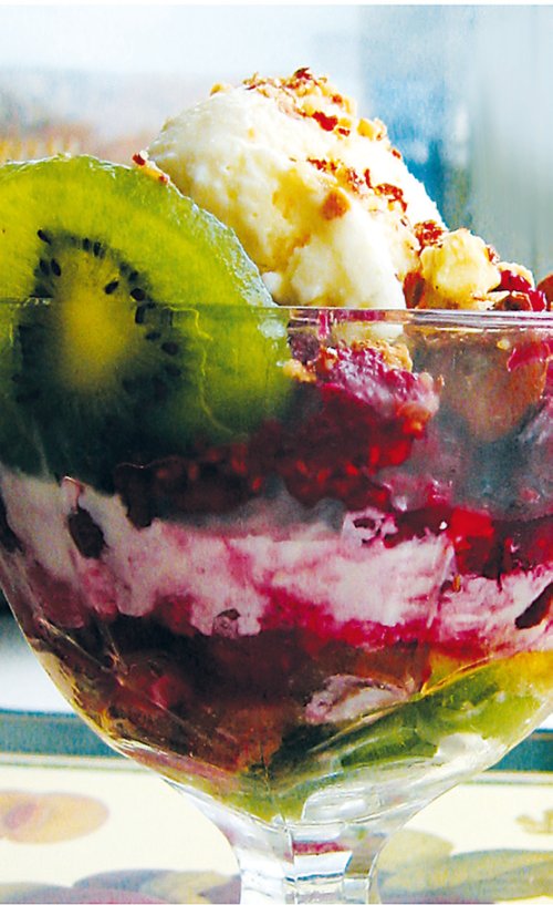 Десерт из мороженого с фруктами
