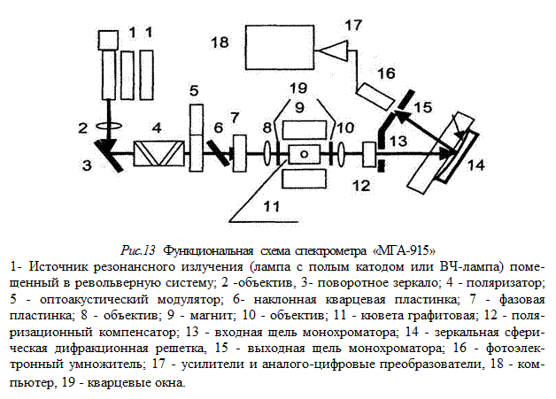 Спектрометр «МГА-915» (рис. 13)состоит из источников резонансного излучения 1 (лампы с полым катодом или ВЧ-лампы), помещенных в барабан револьверной системы, используемой для автоматической смены источников спектрального излучения; объектива 2, поворотного зеркала 3, поляризатора 4, оптоакустического модулятора 5, наклонной кварцевой пластинки 6, фазовой пластинки 7, объективов 8 и 10, магнита 9, графитовой кюветы 11, поляризационного компенсатора 12, входной щели монохроматора 13, зеркальной сферической дифракционной решетки 14, выходной щели монохроматора 15, фотоэлектронного умножителя 16, усилителей и аналого-цифровых преобразователей 17. Спектрометр управляется компьютером 18. В спектрометре «МГА-915» используется следующее пространственное расположение оптических элементов (Рис.13): ● излучение распространяется вдоль оси, которая перпендикулярна направлению силовых линий магнитного поля магнита 9; ● длинная ось оптоакустического модулятора 5 параллельна направлению силовых линий магнитного поля магнита 9; ● оси поляризатора 4 и фазовой пластинки λ/4 (7) повернуты в плоскости, перпендикулярной оптической оси, на угол 45°; ● пластинка 6 повернута в плоскости, перпендикулярной оптической оси, на угол 45° и наклонена к оптической оси на угол около 60°.