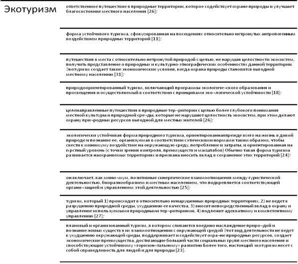 Понятие зеленого туризма достаточно расплывчато и не проработано. С одной стороны, признаком зеленого туризма считают использование экологически благоприятных технологий в туристском обслуживании. С другой – этим термином обозначают отдых в привлекательной природной зоне.