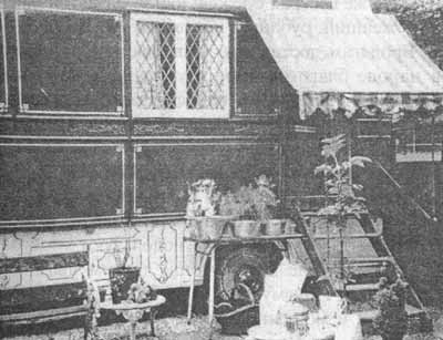 Другие типы вардо выглядят более основательно. Они имеют деревянные стены с окнами, закрыты спереди и сзади. Часто у них бывают стёкла в слегка изогнутых крышах и одно?два окна на каждой стороне. Съёмные ступеньки, приставляемые к переднему борту, во время езды хранят под повозкой. Стены делают из «планок с пенни» (планок толщиной со старую английскую монету в один пенни), прикрепляемых к каркасу. Колёса большие, иногда диаметр передних меньше диаметра задних. Длина таких вардо в среднем 3 метра, а вес – 1,5 тонны. Первое, что больше лсего поражает гауджо в цыганских вардо, – это их украшения. Вардо отделывают искусной резьбой и красят яркими красками, изображая золотые листья. При этом используют красную, зелёную и жёлтую краски и никогда – чёрную. Среди немногих оставшихся мастеров, выполняющих эту работу, – Питер Ингрэм, сам цыган, живущий в Гемпшире. (Уорд?Джексон и Харви написали довольно обстоятельную книгу о вардо: Ward?Jackson С. Н. and Harvey D. E., The English Gypsy Caravan – It's Origins, Builders, Technology and Conservation. Devon, Newton Abbot: David & Charles, 1972.) Сегодня на дорогах можно встретить большие моторизованные дома и маленькие автомобили за ними. Очевидно, второе транспортное средство предназначено для перемещения по округе, после того как моторизованный дом будет установлен на стоянке. Цыгане издавна использовали этот приём. У них были специальные двухколесные экипажи для «мелких поездок»; эти экипажи назывались плоскими повозками или двуколками. Иногда их украшали так же богато, как и вардо. В случае нужды можно было прикрепить к бортам этой повозки обручи и натянуть на них брезент, соорудив таким образом крышу для того, чтобы переночевать. Другое современное дополнение к моторизованному дому – палатка. И опять?таки в этом отношении цыгане давно опередили нынешних туристов: в дополнение к домам на колёсах устанавливали шалаши?бендеры. Цыгане срезали длинные, гибкие ветви, втыкали их в два ряда в землю, пропуская свободные концы через отверстия центрального деревянного бруса.