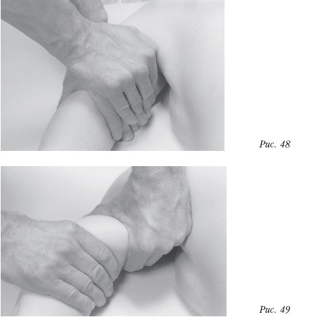 Простое (ординарное) разминание (рис. 47) – поперечное разминание одной рукой. Поперечное разминание, выполняемое двумя руками одновременно – двойное простое разминание Двойной гриф (рис. 48) – поперечное разминание одной рукой с отягощением. Двойное кольцевое разминание (рис. 49) – поперечное разминание двумя руками, выполняемое поочередно и разнонаправленно. Валяние (рис. 50) Пальцы рук массажиста выпрямлены и ладони плотно прижаты к мышце с обеих сторон параллельно друг другу. Не от‑