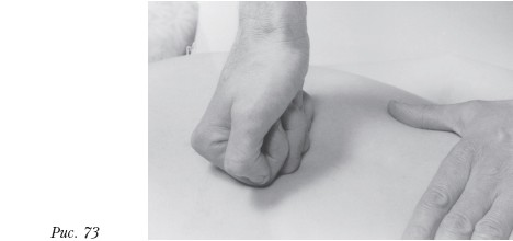 область вторых фаланг пальцев таким образом, чтобы передаваемый импульс был направлен по касательной к поверхности спины пациента снизу вверх. Надо также стараться не наносить ударов по суставам своих пальцев, чтобы не травмировать их. Сила удара соразмеряется с массой и конституцией тела пациента. Рука последовательно переставляется вдоль позвоночника от поясничного отдела к верхнегрудному. Механический импульс, передаваемый позвоночному столбу, позволяет части позвоночника, фиксированной ладонью, совершить микродвижение относительно нижележащих позвонков. Растирание межостистых промежутков (рис. 73) Плоскость третьих фаланг пальцев кисти, сложенной в кулак, располагается поперек позвоночного столба в ложбинке между мышцами, выпрямляющими позвоночник. Вторые меж‑фаланговые суставы устанавливаются на межостистых промежутках соседних позвонков. Легкими неглубокими движениями в поперечном к позвоночнику направлении производят растирание межостистых промежутков, переходя от позвонка к позвонку, начиная с нижних отделов. Для удобства работы эту манипуляцию массажист выполняет рукой, которая ближе шейному отделу, чтобы его руки не перекрещивались и плечевой пояс не разворачивался. Все лишние движения ведут к перерасходу энергии массажиста и усталости.