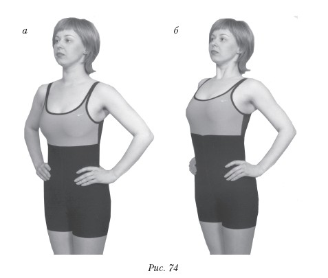 В следующих упражнениях вдохи и выдохи выполняются медленно, плавно, с акцентом на движении живота. Во время вдоха живот максимально выдвигается вперед, на выдохе – втягивается внутрь так, что передняя его стенка приближается к позвоночнику. Активизация живота (рис. 74, а, б) И. п. – стоя, кисти рук – на гребнях подвздошной кости. В д о х – расправить плечи, прогнуться в грудном отделе позвоночника и вытянуться грудиной вверх. Выдох– позвоночник выпрямляется, плечи опускаются в свое естественное положение, живот втягивается внутрь так, что его передняя стенка максимально приближается к позвоночнику. Сознание следит за движением прямой мышцы живота.