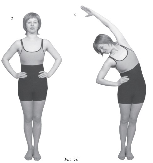 Выдох– повернуть корпус в другую сторону. Вдох– вернуться в исходное положение. Сознание удерживать на наружных косых мышцах живота. Боковые наклоны корпуса (рис. 76, а, б) И. п. – стоя, руки – на подвздошных гребнях. Вдох – одна рука через сторону поднимается вверх до касания бицепсом ушной раковины. Выдох – наклон корпуса в сторону руки, опирающейся на подвздошный гребень. В д о х – выпрямиться. Выдох– опустить руку. Вдох– поднять другую руку.