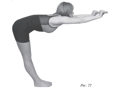 Выдох – наклониться в другую сторону. Вдох– выпрямиться. Выдох – опустить руку. Сознание удерживать на внутренних косых мышцах живота. Вытягивание поясницы (рис. 77) И. п. – стоя у стола на расстоянии шага с опорой рук на край столешницы. Вдох. Выдох – медленно согнуться в пояснице, не отрывая рук от поверхности стола и отодвигая таз как можно дальше. В д о х – выпрямиться. Сознание концентрировать на квадратных мышцах поясницы. Все упражнения необходимо повторить 3–5 раз.