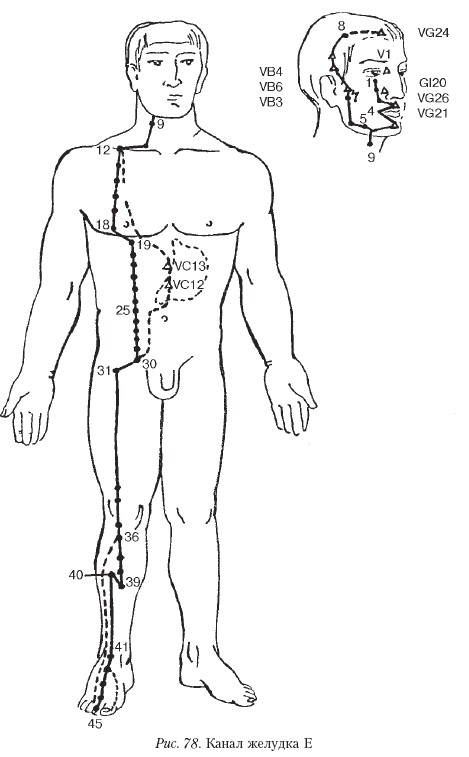 Канал желудка [E] (рис. 78) симметричный, парный, центробежный, янский. Максимальный поток в нем наблюдается с 7 до 9 утра. Энергия поступает из канала толстого кишечника [GI], переключается в канал селезенки‑поджелудочной железы [RP]. Наружный ход канала проходит по передней поверхности тела человека от подглазничной области (под зрачком на середине нижнего края орбиты – E1), далее – вниз по лицу, огибая нос канал выходит к верхней губе, где в точке VG26 зад‑несрединного канала встречается с ветвью противоположной стороны. Ветви огибают рот и вновь встречаются под нижней губой в точке VC24 переднесрединного канала. Далее канал отклоняется кзади и спускается к краю нижней челюсти, кпереди от ее угла. Здесь он делится на головную ветвь и туловищ‑но‑ножную. Первая проходит спереди от ушной раковины, встречается с точками канала желчного пузыря и поднимается до точки Е8 – в углу лба на 1,5 см выше границы роста волос. Туловищно‑ножная ветвь спускается по переднебоковой поверхности шеи на 1,5 цуня кнаружи от щитовидного хряща (точка Е9) до ключичной ямки (здесь начинается внутренний ход), по груди на сосковой линии, в сторону от средней линии груди на 4 цуня до точки Е18 – в пятом межреберье. Идет по животу на 2 цуня в сторону от средней линии, от точки Е19 – у нижнего края хряща VIII ребра до Е30 – у верхнего края лобковой кости, где встречается со своим внутренним ходом. Далее канал выходит на середину паховой связки и спускается по переднебоковой поверхности бедра, обходит надколенник с внешней стороны. По передней поверхности голени канал проходит вдоль боковой стороны большеберцовой кости, к тылу стопы и к корню ногтя II пальца с наружной стороны (E45 – последняя точка). Ответвления канала. Первое от точки Е36 (ниже верхнего края внешнего мыщелка большеберцовой кости на 3 цуня, между передней большеберцовой мышцей и длинным разгибателем пальцев) вдоль боковой стороны большеберцовой кости вниз к тылу стопы между II и III костями плюсны, по боковой стороне III пальца. Второе – от точки Е42, расположенной на самом возвышенном участке тыльной поверхности стопы выше межпальцевого промежутка на 5 цуней, вдоль большого пальца до корня его ногтя, связываясь с каналом селезенки‑поджелудочной железы [RP]. Внутренний ход берет свое начало от надключичной ямки, опускается внутрь, прободает диафрагму, связываясь с желудком и селезенкой. От желудка опускается вниз к тонкому и тол‑