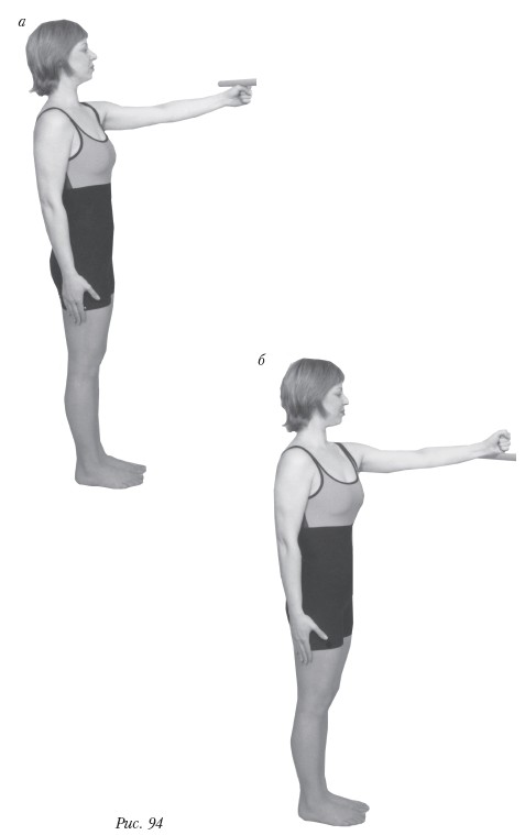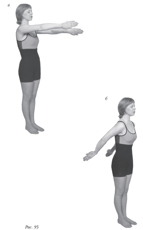 Статическая нагрузка дельтовидной мышцы (рис. 94, а–г) И. п. – стоя одна рука опущена вниз, другая поднята вперед на линию плеч и подведена кулаком, например, под полку. Вдох. Выдох – продолжая разгибать плечо, попытаться поднять руку кпереди, преодолевая сопротивление полки. В д о х – снять нагрузку с мышц руки, переставить кулак на полку сверху. Выдох– преодолевая сопротивление полки, попытаться разогнуть плечо, опуская руку вниз. В д о х – повернуться боком к стене, подвести кулак под полку. Выдох – преодолевая сопротивление, попытаться поднять руку вверх выше горизонтального уровня. Вдох– опустить руку вниз. Проделать аналогичные движения с другой рукой. Усилия должны быть разумны, чтобы не сбросить полку со стены. Сознание удерживать на дельтовидной мышце. Воздействие на мышцы лопатки (рис. 95, а‑г) И. п. – стоя, руки опущены вдоль корпуса. Вдох– не сгибая рук в локтях, закрутить плечи кнутри. Выдох– поднять прямые руки до уровня плеч, одновременно вытягивая их вперед. Вдох– опустить руки. Выдох– продолжая движение кзади, разогнуть руки в плечевых суставах, также вытягивая их вслед за кистями.