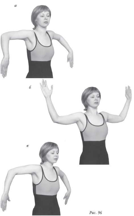 В д о х – опустить руки вниз и закрутить прямые руки кнаружи. Выдох – поднять руки на уровень плеч, вытягивая вперед. Вдох– опустить руки. Выдох– продолжая движение кзади, разогнуть руки в плечевых суставах, также вытягивая их вслед за кистями. Вдох– опустить руки. Темп движений медленный, амплитуда максимальна и ограничивается достигнутой растяжкой мышц. Необходимо постепенно увеличить эти пределы. Сознание удерживать в области лопаток. Закручивание плеч (рис. 96, а‑в) И. п. – стоя, руки опущены вдоль корпуса. Вдох – сгибая руки в локтях, поднять их в стороны до уровня плеч, предплечья оказываются свободно свисающими вниз. Выдох – не опуская плеч, закрутить их кнаружи, так чтобы предплечья оказались в вертикальном положении кистями наверх, попытаться отклонить предплечья от вертикали кзади. В д о х – повернуть руки в плечах до положения предплечьями вниз. Выдох– продолжая закручивать плечи кнутри, пройти вертикаль в нижнем положении предплечий до крайнего возможного положения рук В д о х – снять напряжение в мышцах, закручивающих плечи, вернуться в исходное положение. Сознание удерживается на мышцах плечевого пояса. Повторить упражнения комплекса 3‑5раз.