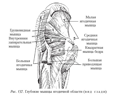 Мышцы тазобедренной области идут от тазового пояса к бедренной кости и производят движение в тазобедренном суставе вокруг всех трех его осей. Передняя группа мышц – сгибатели (рис. 137) Подвздошно‑поясничная мышца состоит из двух головок. Большая поясничная мышца Н: боковая поверхность тел и межпозвонковых дисков XII грудного и I–IV поясничных позвонков, поперечные отростки I–V поясничных позвонков. Спускаясь вниз немного кнаружи подходит к подвздошной мышце. Подвздошная мышца Н: подвздошная ямка подвздошной кости, верхняя передняя и нижняя передняя подвздошные ости тазовой кости. Между краем большой поясничной мышцы и подвздошной в глубокой борозде лежит бедренный нерв. Волокна обеих мышц сходятся в единую мышцу, располагающуюся на передней поверхности тазобедренного сустава, проходят через мышечную лакуну на переднюю поверхность бедра. П: малый вертел бедренной кости. Д: сгибает бедро в тазобедренном суставе; подтягивает его в сторону живота; поворачивает немного во внешнюю сторону; сгибает кпереди таз и туловище при укрепленной нижней конечности.