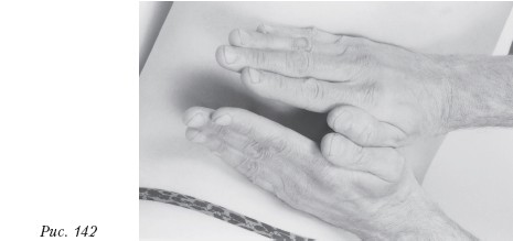 Поглаживание (рис. 139) Плоскостное, поперечное направленное к подвздошным лимфатическим узлам. Пересекание (рис. 32) Большие пальцы обеих рук максимально отведены в плоскости кистей (зев льва). Кисти рук развернуты тыльной стороной навстречу друг другу и устанавливаются лучевым краем зева льва на боковую поверхность поясницы. Попеременными скользящими движениями производят растирание поясницы от позвоночника до наружного края живота. Прием выполняется быстро 120–150 движений в минуту. Сдвигание (рис. 140) Прием глубокого растирания основаниями ладоней. Их плотно прижимают к околопозвоночным мышцам и смещают в поперечном направлении к боковой поверхности поясницы. Прием выполняется сначала одной рукой, потом другой и двумя руками попеременно. Сдвигание с перетиранием (рис. 141) Этот прием – продолжение предыдущего. Выполняя попеременное сдвигание, руку, закончившую движение, оставить на боковой поверхности поясницы. При этом выпрямленные пальцы слегка уходят на переднюю поверхность живота, основание ладони отодвигается от поверхности тела, кисть выпрямляется в пястно‑фаланговых суставах. Другая рука начинает движение от позвоночника и накатывает кожно‑мышечную складку на ладонь первой руки. Движение продолжается с пе‑