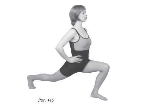 Растяжка мышц – разгибателей таза (рис. 145) И. п. – стоя, руки на поясе, ступни параллельны. Вдох– широкий шаг вперед, отрывая пятку выпрямленной назад ноги от пола. Выдох– медленно опуститься вниз как можно глубже, прогибаясь в поясничном отделе позвоночника. Вдох– вернуться в исходное положение. Сознание удерживать на передней поверхности таза и малом вертеле бедренной кости. Вытянутую назад ногу не сгибать в коленном суставе. Повторить по 9 раз на каждую ногу.
