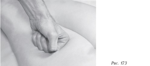 Плоскостное разминание – работа основаниями ладоней. Валяние (рис. 50). Этот прием можно выполнить на небольшом по мышечной массе бедре. Выжимание (рис. 173) Прием проводится от коленного сустава по направлению к паховым лимфатическим узлам и к подвздошным областям. Выжимание проводится на этой поверхности тела так же, как и на ягодицах – тыльной поверхностью первых фаланг пальцев кистей, сложенных в кулак. Можно работать одной или двумя руками одновременно. Date: 2015-09-17; view: 439; Нарушение авторских прав |