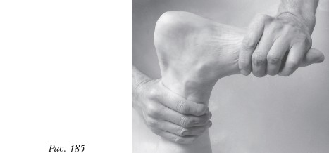 бание стопы, которому оказывают сопротивление в течение десяти секунд. После этого стопа расслабляется и массажист проводит дополнительное вытяжение подошвенного апоневроза после изометрической нагрузки. Постизометрическая релаксация ахиллова сухожилия (рис. 185) Действия массажиста аналогичны предыдущим, только рука, удерживавшая пятку, перемещается в зону ахиллова сухожилия выше голеностопного сустава. Тыльным сгибанием стопы вытягивается ахиллово сухожилие, потом дается изометрическая нагрузка без изменения положения стопы и дополнительная растяжка после снятия напряжения в работающих мышцах. Встряхивание нижней конечности (рис. 89) Массажист фиксирует голеностопный сустав, удерживая одной рукой голень, другой – стопу, слегка вытягивает ногу и совершает легкие колебательные движения всей ноги пациента в плоскости массажного стола.
