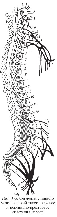 Нервная система человека условно делится на центральный отдел – спинной и головной мозг: и периферический отдел, составленный из спинномозговых и черепных нервов, нервных сплетений и нервных узлов. Спинной мозг лежит в спинномозговом канале и представляет собой длинный цилиндрический тяж, который вверху переходит в продолговатый мозг головного мозга, а внизу заканчивается конусом на уровне II поясничного позвонка. От конуса отходит книзу концевая нить, являющаяся продолжением оболочек спинного мозга, которая прикрепляется ко II копчиковому позвонку. Нервные клетки, составляющие ЦНС, залегают в сером веществе спинного и головного мозга. Белое вещество образовано нервными волокнами, которые являются проводниковым аппаратом. С двух сторон спинного мозга из него выходят корешки спинномозговых нервов, они образуют два продольных ряда. Передние корешки составляют двигательные волокна, задние – чувствительные. На некотором расстоянии от спинного мозга они объединяются, образуя ствол спинномозгового нерва называемого канатиком (фуникулом). При воспалении канатика возникают расстройства и двигательной, и чувствительной сфер; при заболевании корешка (радикулите) наблюдаются расстройства одной сферы (или чувствительной, или двигательной); при воспалении ветвей нерва (неврите) расстройства соответствуют зоне распространения нерва. Серое вещество спинного мозга залегает в его центре и окружено со всех сторон белым веществом. На поперечном срезе спинного мозга столбы серого вещества имеют вид бабочки. Для спинного мозга характерно сегментарное деление, нервный сегмент – это поперечный отрезок спинного мозга и связанных с ним правого и левого спинномозговых нервов. Всего в спинном мозге 31 сегмент (рис. 192). На рис. 193 изображены два сегмента спинного мозга с корешками. Спинной мозг покрыт тремя оболочками: твердой, паутинной и сосудистой. Пространство между внутренними оболочками – паутинной и сосудистой – заполнено спинномозговой жидкостью – ликвором. Оболочки спинного мозга соединяются с соответствующими оболочками головного мозга и лик‑вор имеет возможность омывать и головной и спинной мозг.