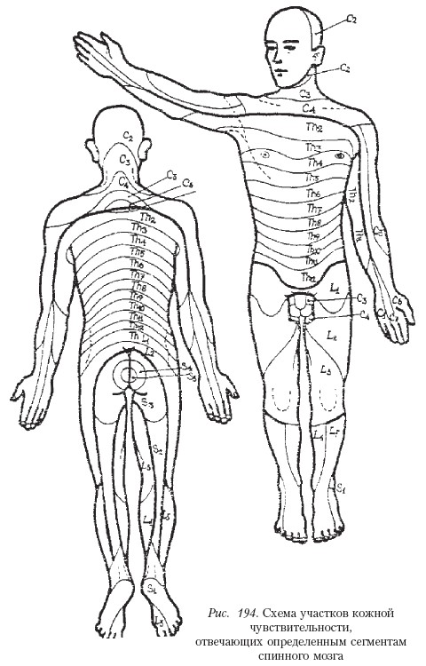 Крестцовое сплетение образуется из поясничных и крестцовых нервов, располагается на передней поверхности крестца в толще грушевидной мышцы. Среди них – ягодичные нервы, седалищный нерв. Он самый толстый и в подколенной ямке переходит в общий малоберцовый и большеберцовый нервы. Черепные нервы берут начало в головном мозге, покидают полость черепа через отверстия в его основании и разветвляются в основном в голове и шее, а блуждающий нерв – также в грудной и брюшной полостях. На рис. 194 изображена схема участков кожной чувствительности, отвечающих определенным сегментам спинного мозга.