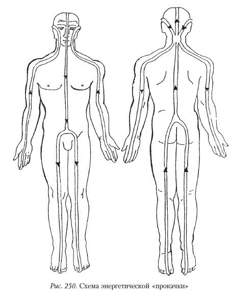 Перед началом этой работы необходимо провести предварительное расслабление тела. Исходное положение: сидя на стуле, спина выпрямлена, голова, шея – на одной линии, руки на коленях, глаза закрыты. Всякое искаженное положение тела, особенно искривление позвоночника, ведет к ограничению проходимости основных каналов, поэтому выбранное положение тела необходимо удерживать в течение всей процедуры. Используем законы о материальности мысли и о том, что все вокруг живое, в том числе и отдельные части человеческого тела. Мысленно обратитесь ко всем частям своего тела с просьбой максимально расслабиться. Опустите волну расслабления сверху вниз от головы к ногам, проговаривая фразы: • расслабляются рот, глаза, лоб; • лицо, голова расслаблены; • расслабляется шея сверху вниз; • надплечья расслаблены; • расслабляются руки от плечевых суставов к кистям и обратно; • грудь, живот и все внутренние органы расслаблены; • расслабляется поясница; • спина расслабляется вдоль позвоночника снизу вверх и к боковым поверхностям туловища; • волна расслабления опускается по спине и тазу; • расслаблен таз и все внутренние органы расслаблены; • расслабляются бедра, колени, икры, голени; • ступни расслаблены. Еще раз окиньте внутренним взглядом трудно поддающиеся расслаблению участки тела и попросите их расслабиться. Особое внимание уделите лицу. Если на лице гримаса напряжения, то и в теле неизбежно найдутся мышцы, которые откликнутся на нее напряжением. Теперь можно приступить к собственно прокачке каналов энергией (см. рис. 250). Помните, что энергии вокруг много – самой разной, в том числе и той, что необходима лично вам именно сейчас. Задача в том, чтобы дать себе труд запустить эту энергию в свое тело и помочь ей разойтись по каналам.