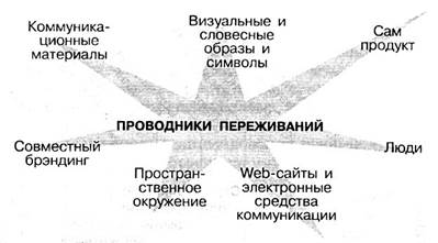 Активизация стратегических модулей ощущений, чувств, размышлений, действий и соотнесения производится посредством того, что я называю проводниками переживаний (ПП). Речь идет о тех тактических компонентах реализации ощущений, чувств, размышлений, действий и соотнесения, которыми пользуется маркетолог при реализации той или иной рекламной кампании. Проводниками переживаний являются коммуникационные материалы, визуальные и словесные образы и символы, сам продукт, совместный брэндинг, пространственное окружение, электронные средства и люди (см. схему).