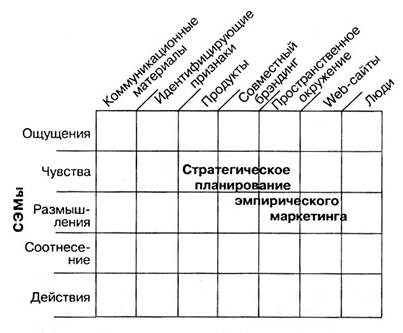 Используя СЭМы и ПП, можно создать эмпирическую сетку (см. схему), являющуюся ключевым стратегическим инструментом эмпирического маркетинга. С применением сетки вам как менеджеру предстоит решить, какие именно ПП должны быть использованы при формировании того или иного СЭМа, что в итоге создаст в сознании потребителя определенный образ вашей компании и(или) брэнда. К этому вопросу мы еще вернемся в главе 10, а сейчас остановимся на отдельных ПП.