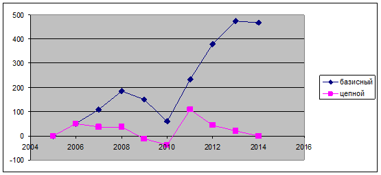Рис.2.6 Динамика объем убытков по убыточным кредитным организациям в 2005-2014 г. Динамика темпов прироста представлена на рисунке 2.4, 2.5 и 2.6. Проведем анализ объема прибыли действующих кредитных организаций, а также составим прогнозное значение на 2015-2016 год. На рисунке 2.7 представлена динамика объема прибыли действующих кредитных организаций в период 2004-2014 год.