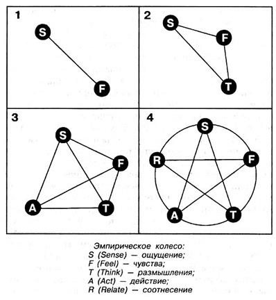 Впрочем, вопрос о том, когда (и как) формируются гибриды, остается открытым. Чаще всего гибриды не конструируются сразу и комплексно. Они рождаются после того, как компания осознает, что ее нынешняя идентичность, ее продукты или средства коммуникации более не достигают потребителя, не обладают конкурентным преимуществом или слишком примитивны. В итоге принимается решение распространить эмпирический подход за рамки единственного СЭМа. Инструментом планирования гибридов, которым я неоднократно пользовался в процессе консультирования своих клиентов, является так называемое эмпирическое колесо. Его можно сравнить с рекламными моделями иерархии эффектов, которые широко применяются в традиционном маркетинге свойств и преимуществ (см. схему).
