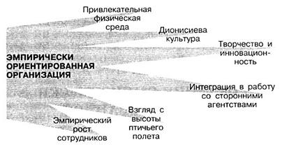 В главах 9 и 10 мы говорили о гибридах, холистических переживаниях, а также о маркетинговой и бизнес-стратегии в области эмпирического маркетинга. Наилучшим образом эти вопросы могут рассматриваться, решаться и планироваться только в условиях организации, повернутой лицом к эмпирическому маркетингу. Эта последняя глава как раз и посвящена построению эмпирически ориентированной организации, задаче, реализация которой требует переосмысления роли маркетинга и бизнеса как таковых. Ниже будут перечислены и кратко охарактеризованы свойства идеального для развития потребительских переживаний типа организации (см. схему). Будет продемонстрировано также, что суть требуемых изменений касается не столько организационной структуры компании, сколько формирования особой атмосферы, которой был бы пропитан весь комплекс корпоративной культуры. Я называю такую новую культуру «дионисиевой организацией» (см. далее). Кроме того, компания, которая твердо намерена воспользоваться преимуществами эмпирического маркетинга, должно делать осознанный акцент на активизацию творческого и инновационного потенциала, следуя идее социокультурного вектора потребления (см. главу 1), отслеживать проявление общих долгосрочных тенденций в окружающем мире («взгляд с птичьего полета»). Более того, эмпирически ориентированная организация рассматривает проявляемые ее сотрудниками творческие и инновационные качества как самый ценный для себя интеллектуальный капитал. Исходя из этой позиции набор, подготовка и совершенствование «эмпирического» мастерства становятся ключевыми моментами политики в области человеческих ресурсов и «внутреннего маркетинга». Наконец, при выработке стратегии и дальнейшем развитии своих эмпирических программ организация должна опираться на экспертное мнение специализированных фирм. В этой связи далее будет рассмотрен вопрос интеграции в совместную работу с творческими агентствами.