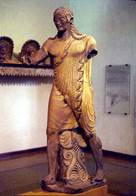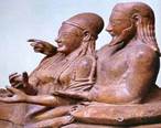 Апполон из Вей Подлинно самобытному этрусскому искусству так и не суждено было перейти от архаики к подлинной классике. Типично архаический Апполон из Вей - самый, вероятно, совершенный из дошедших до нас памятников этрусской скульптуры. Он очень похож на современных ему греческих куросов и в то же время резко отличен от них. Этрусский Апполон не обнажён и не неподвижен; он как бы шагает куда-то.. Улыбка играет в его глазах и вокруг рта. Это архаическая улыбка, но ни у одного греческого Апполона мы не увидим такой острощемящей, пронзительной улыбки. Эта улыбка вещает не о грядущем радостном упоении, а о чём-то другом, загадочном, не передаваемом словами. Приверженность не к идеальному, как у греков, а к характерному, индивидуальному привело к главному достижению этрусков в области скульптуры - портрету. Он развивался из оформления урн-каноп для сожжённого праха умерших, которые изображаются возлежащими, повторяя позы пирующих.